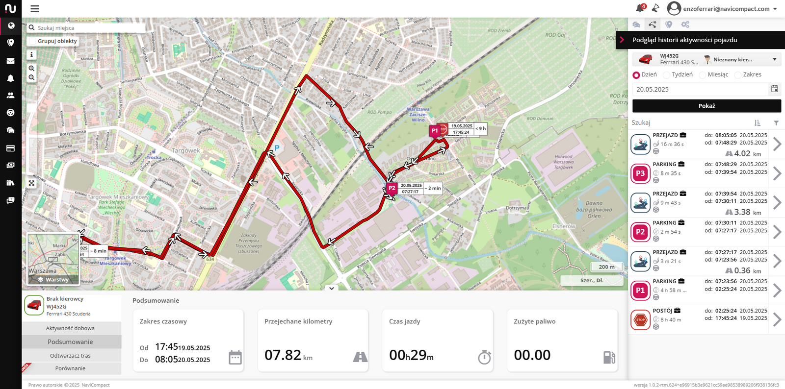 • Podgląd parametrów jazdy – prędkość, postoje, dystans