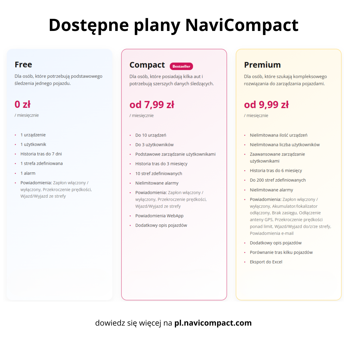 * Na koncie FREE możesz mieć 1 pojazd i 1 lokalizator. Dodanie kolejnych wymaga przejścia na plan COMPACT lub PREMIUM – wtedy wszystkie pojazdy i lokalizatory są rozliczane zgodnie z cennikiem.